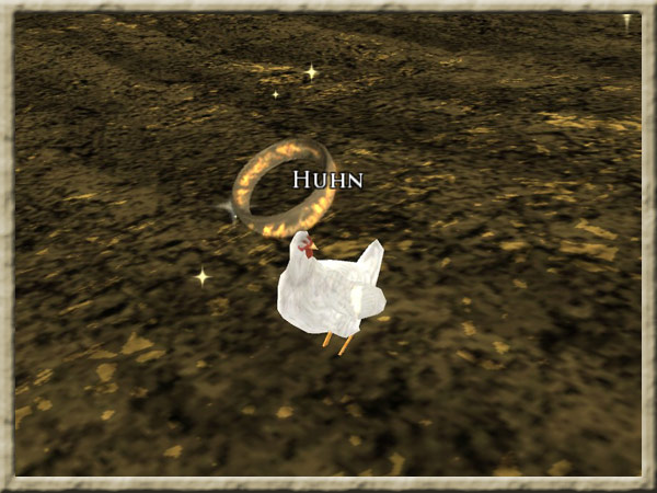 | Sobald man eines aufgenommen hat, muss man es im Garten von Gerald zu den anderen Hühnern bringen. |