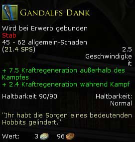 Frodo Beutlin ist in Bilbos Zimmer im Erdgeschoss des Letzten Heimeligen Hauses in Bruchtal. Gandalf der Graue hat Euch gebeten, mit Frodo Beutlin zu sprechen und Euch einen Eindruck von seiner Gemütslage zu machen. Hintergrund Gandalf der Graue macht sich Sorgen um seinen Hobbit-Freund Frodo Beutlin, der sich bereit erklärt hat, sich an einem gefährlichen und hochgeheimen Auftrag zu beteiligen. |