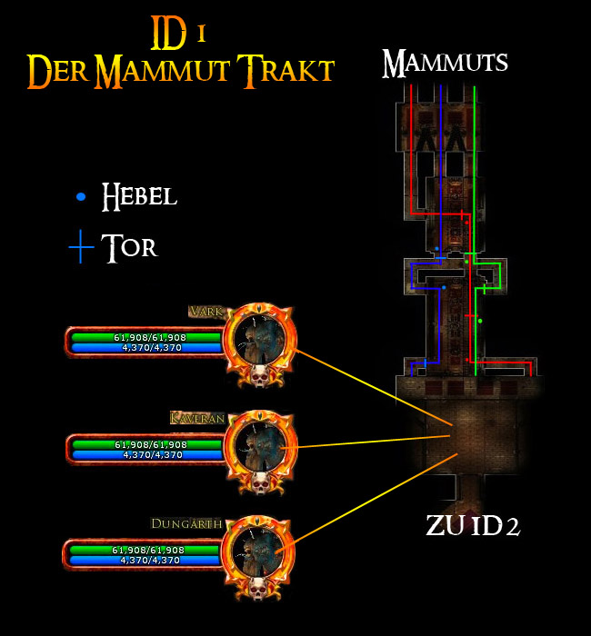 Die Verteilung der Gruppen auf die drei Gänge sollte anhand des Aufbaus der Gegnergruppen in den Gängen passieren. Sollte eine Gruppe in einem Gang von einem Mammut überrannt werden, wird der Kampf zurückgesetzt. Ausgelöst wird der Kampf, wenn alle 6 Plateaus vor den Gängen besetzt sind. In den Gängen gibt es neben den Gegnern noch Hebel, welche gezogen werden müssen. Die Hebel werden immer erst aktiv, In der folgenden Übersicht sind die Gegnergruppen, Tore und Hebel mit den entsprechenden Auswirkungen zu sehen |
