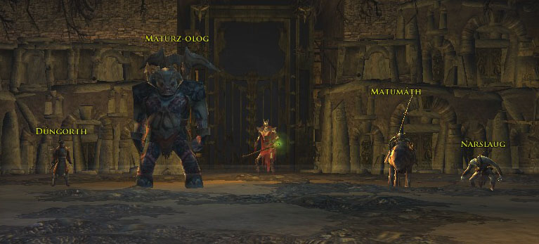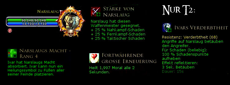 Auf T2 ist der Schaden, den der SZ von Waffenmeistern und Ivar erhält, um einiges größer als auf T1. Daher empfiehlt es sich, auf jeden Fall die Variante mit 2 Hauptleuten zu spielen, um den Schaden in der letzten Phase gegen Ivar abfedern zu können und die zusätzlichen Moralpunkte, die Ivar auf dieser Stufe besitzt, ebenfalls zu vernichten, bevor Ivar den Schlachtzug zerlegt. Für T2 gibt es eine empfohlene Variante, die vergleichsweise einfach zu spielen ist: Dúngorth, Narslaug, Matúrz-Olog |