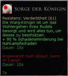 | Die Warge beginnen sich zu heilen, wenn deren Verderbtheit nicht entfernt wird. Dies sollte gleich nach Kampfbeginn erfolgen. Sollte dieser Buff zwei Mal oder öfter auf dem Warg sein, kann man den Kampf auch gleich resetten. |