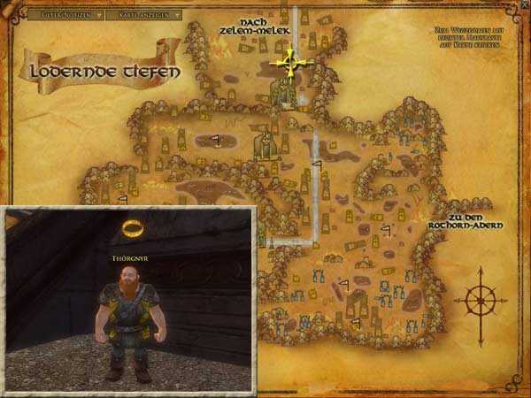 Der Spiegel befindet sich südöstlich der Aschenkreuzung, die im Südwesten von Anazârmekhem liegt. Die Kreaturen der Lodernden Tiefen haben sich am Zwergenspiegel zu schaffen gemacht. Hintergrund Der Spiegel in den Lodernden Tiefen wird immer wieder von Tiefenwürmern, feurigen Lindwürmern und den Ghâsh-hai verstellt. |