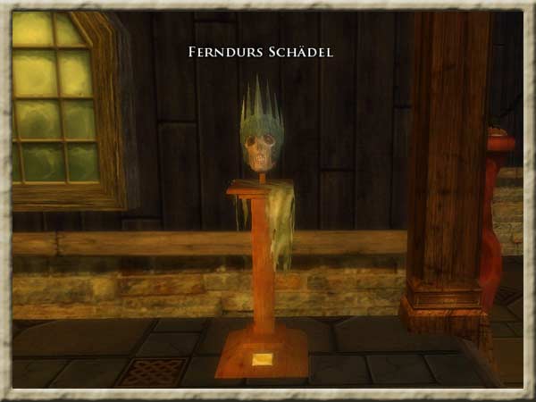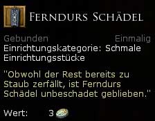 Ferndurs Schädel bekommt man von Fendur, einem Elite-Meister in Imlad Balchorth in Angmar. Sten Weissdorn in Bree baut den Gegenstand dann zu einer Trophäe um. |