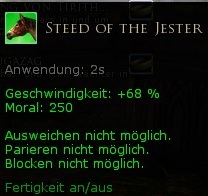 Das Ross des Wächters muss stark und ausdauernd sein, um das Gewicht der schweren Rüstung und Waffen seines Herrn zu tragen. Dieses kräftige Ross hat ein attraktives stahlgraues Fell mit einem langen Schweif und sein robustes Sattelzeug ist ideal, um Waffen, Schilde und Vorräte für eine lange Reise in den Krieg und in Gefahren zu tragen. Dieses Ross verfügt über 250 Lebensenergie und ermöglicht es Ihnen, 68 % schneller als zu Fuß zu reisen. Das Ross konnte man mehrfach in der Lotterie gewinnen, bevor es im Shop eingefügt wurde. Angebot zeitlich begrenzt: 23. November bis 8. Dezember 2011 |