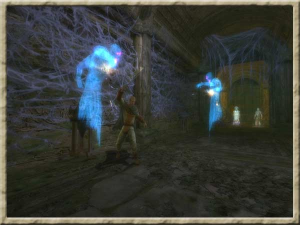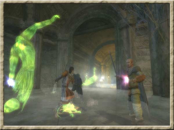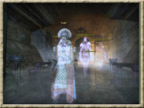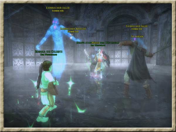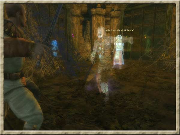 Nach dem ersten Kampf erscheint der Geist von Abb. Dieser löst einen Furcht-Effekt aus wenn man ihm und seinen Geistern zu nahe kommt. Das Problem an der Sache ist, dass Abb der Gruppe ganz langsam hinterhergeht. Wenn man sich also bei den folgenden Kämpfen zu viel Zeit lässt, holt Abb die Gruppe ein. |