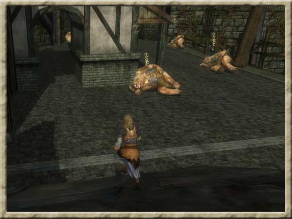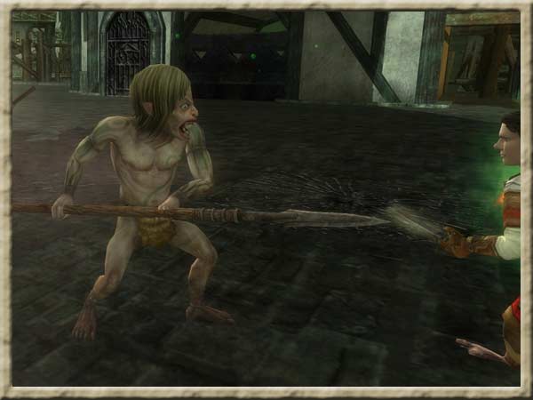 Sobald die Gruppe bei Erscin angekommen ist, sieht man zwei Trolle die auf ein paar Bergmenschen einschlagen. |