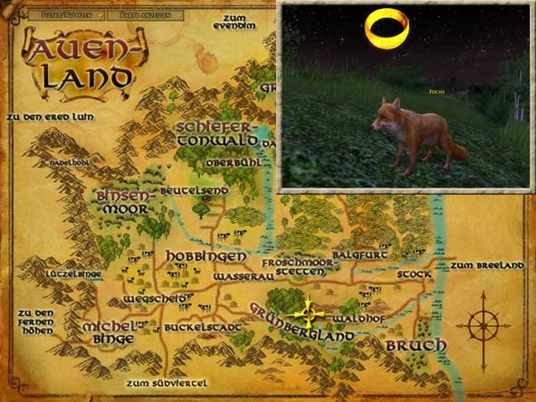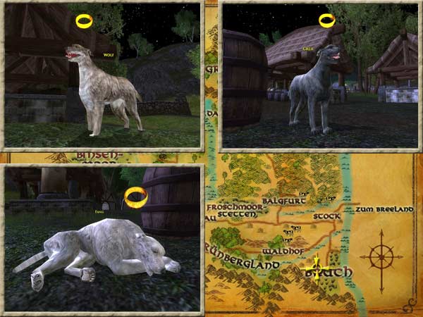 Der Fuchs ist auf der Straße nach Stock. Die alte Sally wandert oft in die Berge östlich von Buckelstadt, im Osten von Sandsons Hof. Fang, Greif und Wolf patrouillieren vor Langfurch, weit im Osten von Sandsons Hof und südlich entlang des Brandyweinflusses. Georg hat Euch gebeten, mit den Tieren des Auenlands zu sprechen. Ihr solltet den Fuchs, die alte Sally, Fang, Greif und Wolf im Auenland aufsuchen. |