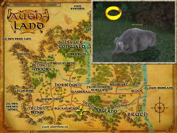 Der Fuchs ist auf der Straße nach Stock. Die alte Sally wandert oft in die Berge östlich von Buckelstadt, im Osten von Sandsons Hof. Fang, Greif und Wolf patrouillieren vor Langfurch, weit im Osten von Sandsons Hof und südlich entlang des Brandyweinflusses. Georg hat Euch gebeten, mit den Tieren des Auenlands zu sprechen. Ihr solltet den Fuchs, die alte Sally, Fang, Greif und Wolf im Auenland aufsuchen. |