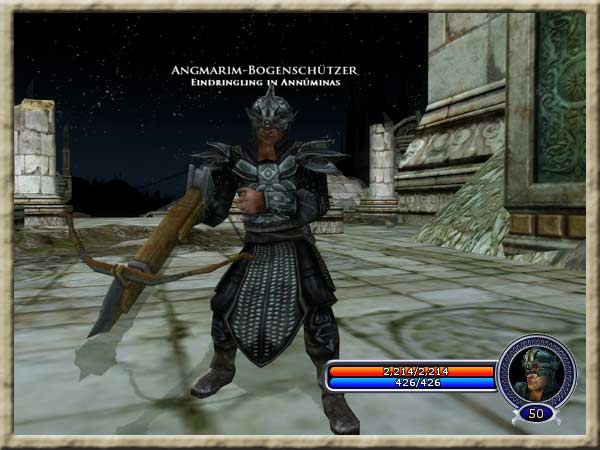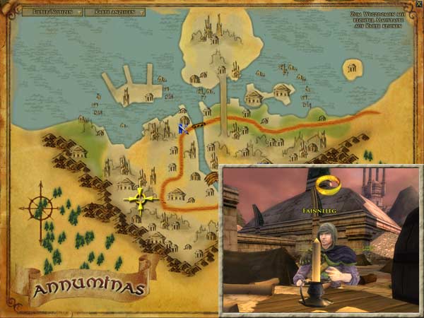 Gwonil ist am Kai des Hafens von Annúminas, nördlich von Echad Garthadir. Torchirion ist bei Adannon, einem kleinen Tor in der Stadtmauer westlich des Kais, von dem aus das Westufer des Nenuial-Sees zugänglich ist. Überall in der Stadt sind Bogenschützen der Angmarim, oft in einem Hinterhalt. Fainneleg hat Euch gebeten, Gwonil und Torchirion zur Hilfe zu eilen, denn er fürchtet, dass die Waldläufer ihre Stellungen bei einem weiteren Angriff nicht mehr halten können. Außerdem hat er Euch gebeten, möglichst viele Angmarim-Bogenschützen zu vernichten, denen Ihr auf Eurem Weg durch die Stadt begegnet. Hintergrund Fainnelegs Waldläufer sind nicht zahlreich genug, um die Stadt gegen wiederholte Angriffe durch Amarthiels Diener zu verteidigen. |