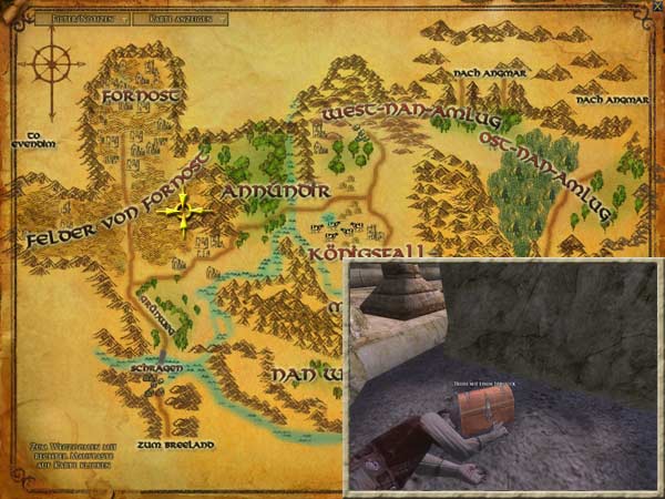 Wilhelm Spitz wartet in Amon Raith südlich von Amon Amrûn auf die Rückgabe seiner Truhe mit dem Erbstück. Inmitten der Ruine von Amon Amrûn habt Ihr den Knecht tot neben Wilhelm Spitzens Truhe gefunden. Ein schauerlicher Anblick. Ihr solltet sofort mit der Truhe nach Amon Raith zurückkehren. |