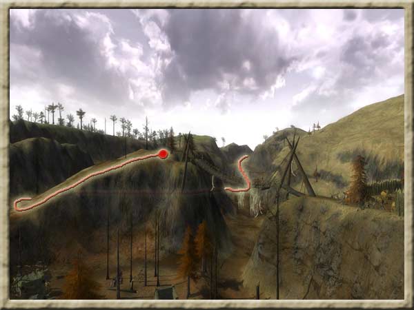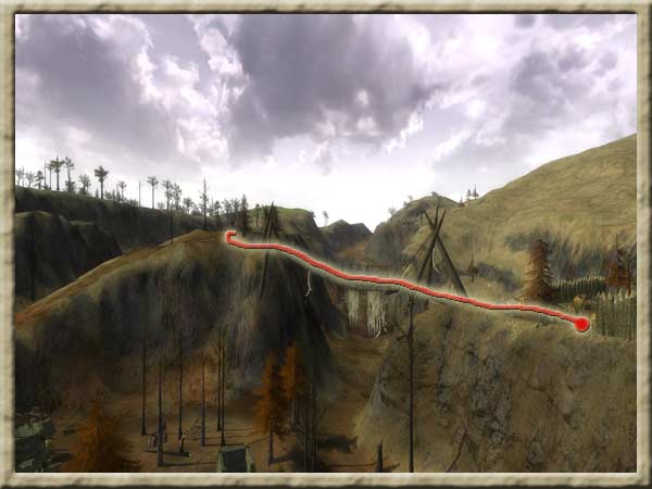 Das erste Feuer findet man auf dem Südwesthügel. Am besten gelangt man dorthin, wenn man den eingezeichneten Weg folgt. Erst auf dem Hügel trifft man dann auf Elite-Gegnergruppen. |