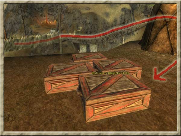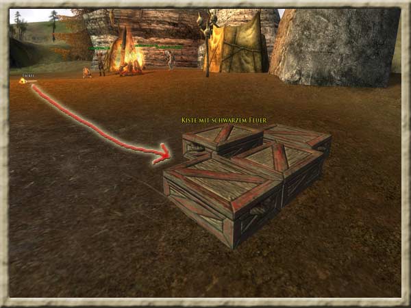 Die Kisten mit dem schwarzen Feuer sind auf den drei Hügeln in Nan Wathren. Aggy Grabgras sagte, es gäbe in Nan Wathren drei große Hügel, die durch Seilbrücken miteinander verbunden sind. Sie hat Euch gebeten, diese Hügel nach weiteren Kisten mit schwarzem Feuer abzusuchen. Sie empfahl Euch, die Augen nach Halborks offenzuhalten, da Vollblut-Orks zu primitiv sind, um magische Dinge wie das schwarze Feuer herzustellen. Da das Schwarzfeuerpulver explodiert, wenn es mit Feuer in Berührung kommt, hat Aggy Euch gebeten, das schwarze Feuer mit der Fackel zu berühren und vollständig zu zerstören. Sie legte Euch außerdem nahe, Freunde mitzunehmen. Hintergrund Aggy Grabgras hat diese üble Substanz, die Ihr gefunden habt, "schwarzes Feuer" genannt und als dunkle Magie der Orks bezeichnet. Sie glaubt außerdem, dass die Orks mehr davon haben und dass es zerstört werden muss, wenn Schragen gerettet werden soll. |