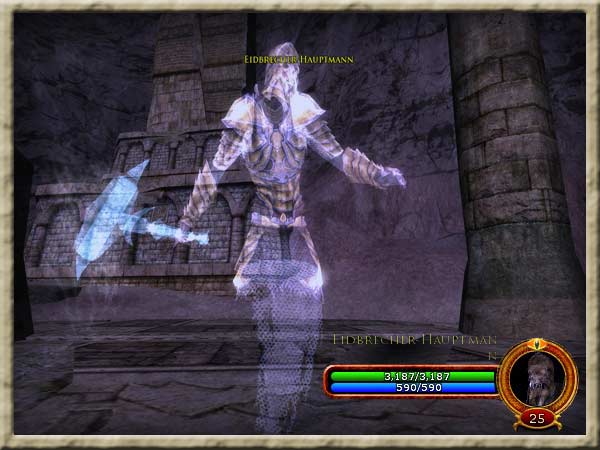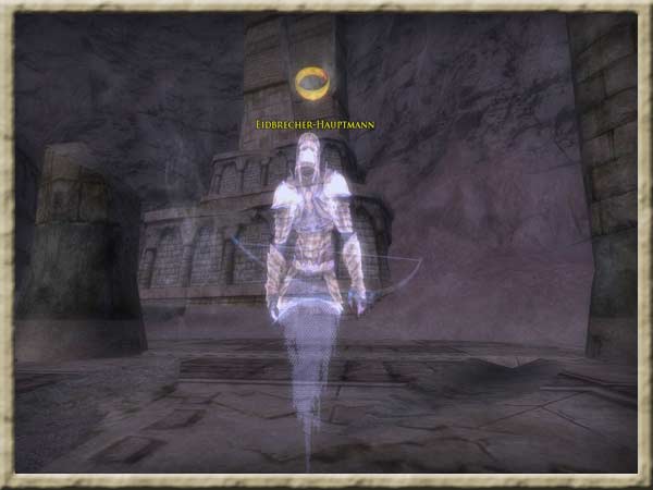 Ihr findet den Schatten des Eidbrecher-Hauptmanns nordöstlich von Minchams Lager, in zerfallenen Ruinen nahe den Mauern von Fornost. Mincham hat Euch gebeten, den Schatten des Eidbrecher-Hauptmanns zu finden, und ihn zusammen mit seinen Gefolgsleuten an ihre uralte Pflicht zu erinnern. Hintergrund In der Zeit von König Arvedui, dem letzten König von Fornost, verriet eine Gruppe seiner Männer ihren Schwur an Arthedain, und so fiel Fornost an die Armeen von Angmar. Arvedui belegte diese Männer mit dem Fluch, erst dann wieder zu ruhen, wenn sie ihren Schwur erfüllt haben. |