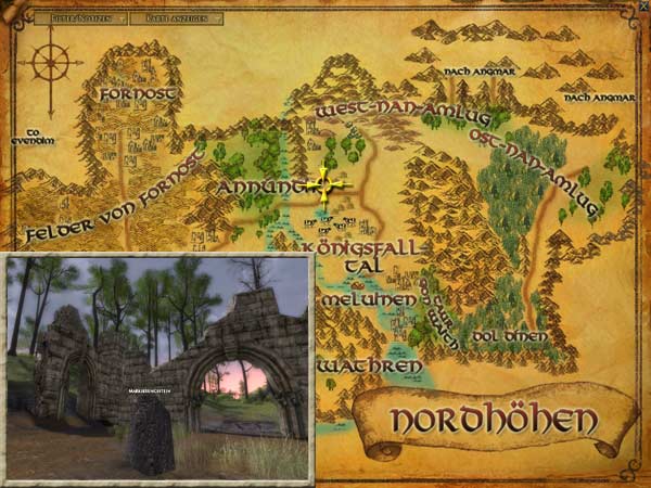 Orthonn ist bei den Ruinen der Feste Lagoros, westlich von Gatsons Hof. Ihr habt einen Markierungsstein entdeckt, laut dem einem Vorfahren von Gatsons Knecht Gilmar ein Stück Land vermacht wurde. Gilmar hat Euch gebeten, mit dem Waldläufer Orthonn zu sprechen, um mehr über diesen Vorfahren zu erfahren. |