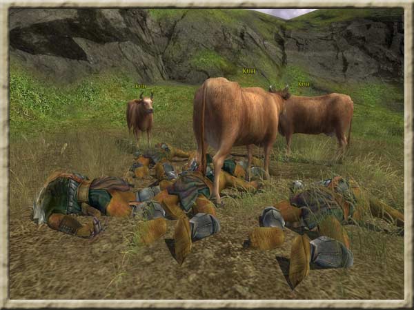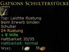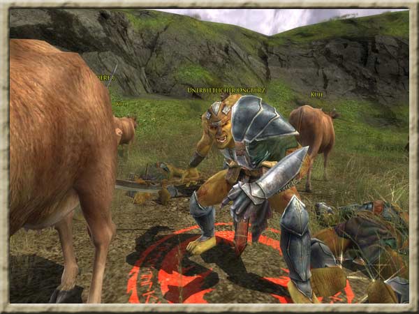 Gatsons Knecht Alwin ist bei der Herde südlich des Hofs. Gatson bittet Euch, seinem Knecht Alwin zu helfen, seine Herde gegen die plündernden Orks zu verteidigen. Stellt sicher, dass weder Alwin noch ein Stück Vieh zu Schaden kommen. Hintergrund Eure Angriffe auf die Orks auf Gatsons Feldern haben deren Zorn erregt. Gatson rechnet jeden Moment mit einem Überfall. |
