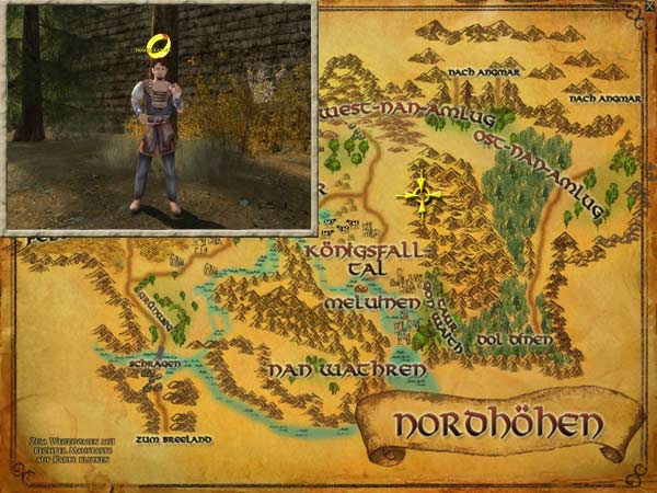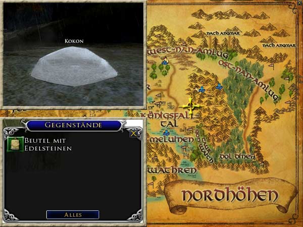 Der vermisste Beutel mit Edelsteinen befindet sich südlich von Esteldín irgendwo in dem Gebiet, das man "Die Falle" nennt. Holger Gerber, ein Händler, der nur knapp einem Angriff der Spinnen entronnen ist, hat Euch gebeten, den vermissten Beutel mit Edelsteinen seiner Freunde aus dem Spinnenbau wiederzubeschaffen. Hintergrund Holger Gerber ist der Überlebende einer Gruppe von Händlern, die im Königsfall-Tal in einen Hinterhalt der Spinnen gerieten. Die Händler führten einen wertvollen Beutel mit Edelsteinen mit sich, den die Spinnen zusammen mit einem der toten Körper fortschleiften. |
