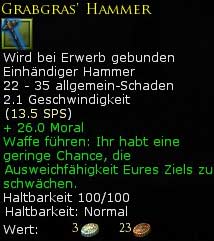 Lugbas verbirgt sich vermutlich im äußersten Südosten des Nan Wathren. Aggy Grabgras berichtete Euch von einem Schlupfwinkel im Südosten des Nan Wathren, auf den höchsten Hängen, wo sie sich als Kind versteckt hat. Sie glaubt, dass Ihr Lugbas dort finden werdet. Aggy hat Euch angefleht, Lugbas zu töten, bevor er noch mehr schwarzes Feuer herstellen kann. Hintergrund Aggy Grabgras glaubt, dass die Gefahr des schwarzen Feuers erst dann wirklich gebannt ist, wenn dieser Lugbas tot ist, von dem die Halborks sprachen. |