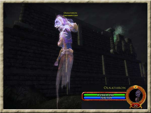 Ihr findet Olnathron westlich der Gräber von Minchams Frau und seinem Kind. Weil er um seine Willensstärke fürchtet, hat Mincham Euch gebeten, den Grausamen Geist, der die Gestalt seiner Frau angenommen hat, zu finden und zu stellen. Hintergrund Mincham hat die unruhigen Träume beschrieben, die er seit kurzem hat. Er glaubt, dass ein Grausamer Geist, eine böse Kreatur der Dunkelheit, die Gestalt seiner toten Frau angenommen hat. |