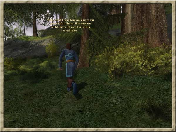 Thaliollang ist in Lin Giliath, nordwestlich von Taur Gonwaith. Thaliollang wird sich freuen zu hören, dass Ihr Lagorlam aus dem Wald von Taur Gonwaith gerettet habt. |