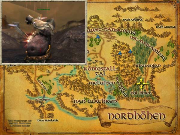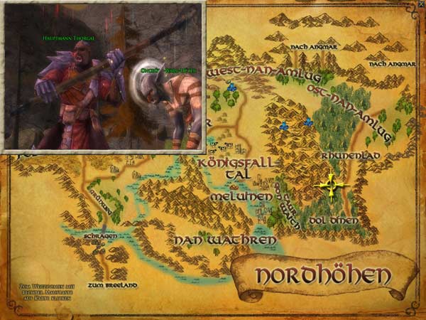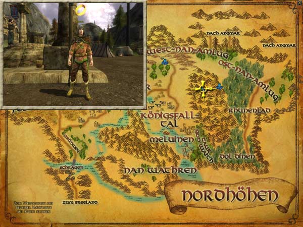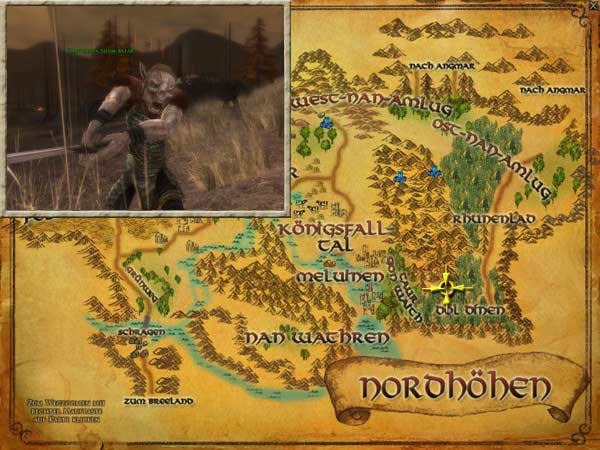 Die Ongbúrz-Hauptleute Thorgal, Shum-batar und Dombrî wurden zuletzt unter den Warg-Hütern im Ork-Lager in Dol Dínen südöstlich von Esteldín gesehen. Arohir erzählte Euch von der Entdeckung dreier Hauptleute des Blogmal-Stammes, die die niederen Ränge des Ork-Heeres kommandieren: Thorgal, Shum-batar und Dombrî. Er glaubt, dass ihr Tod Verwirrung unter den einfachen Soldaten stiften würde. Er empfiehlt Euch jedoch, dieses Unterfangen nicht allein anzugehen. Hintergrund Ein gewaltiges Ork-Heer wütete durch Ram Dúath und verjagte die Menschen der Nordhöhen von ihren Höfen. Esteldín, die Heimat der wenigen verbliebenen Dúnedain des Nordens, blieb unentdeckt. Deshalb beginnen die Waldläufer dort, einen Gegenangriff gegen die Schwarze Flut von Angmar zu ersinnen. |