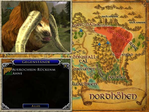 In den Ebenen und Bergen von Rhunenlad und dem östlichen Nan Amlug grasen Auerochsen. Gondranc hat aus Asikkos Buch erfahren, dass die Erdsippe die dicken Schulterfelle der Auerochsen dazu verwendet, ihre Rüstungen zu polstern. Er bittet Euch, Auerochsen zu jagen und ihm diese Rückenmähnen zu bringen. Hintergrund Auf Bitte des Waldläufers Gondranc hin habt Ihr das Lager der Erdsippe nordöstlich von Esteldín aufgesucht, um ein Buch über Lederkunde zu holen, das Asikko, der Anführer der Erdsippe, ihm versprochen hatte. Ausgestattet mit diesem Wissen wird er viel bessere Rüstungen für die Leute von Schragen anfertigen können. |