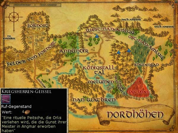 Orks sind in Dol Dínen südöstlich von Esteldín in den Nordhöhen sowie in Malenhad zu finden, weit nördlich von Esteldín in den südlichen Bereichen von Angmar. Nethúr ist in Esteldín. Nethúr hat Euch gebeten, ihr eine Kriegsherren-Geißel von den gerissensten Orks der Armee Angmars zu bringen.