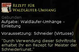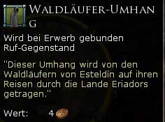 Techeron ist in Esteldín in den Nordhöhen. Techeron hat Euch gebeten, einige Waldläufer-Umhänge für seine Leute zu weben. Hintergrund Die Waldläufer von Esteldín brauchen warme Umhänge für die kommenden Tage. |