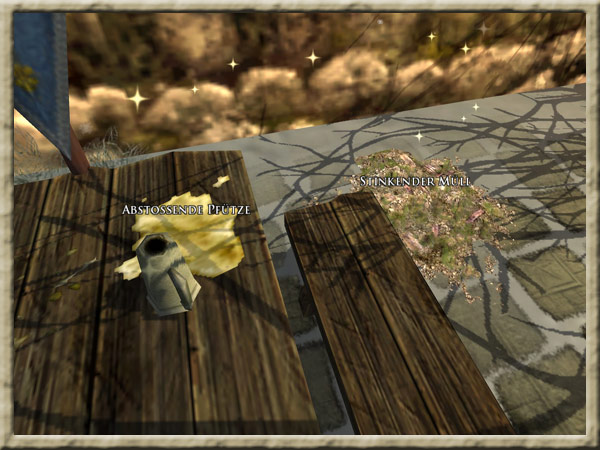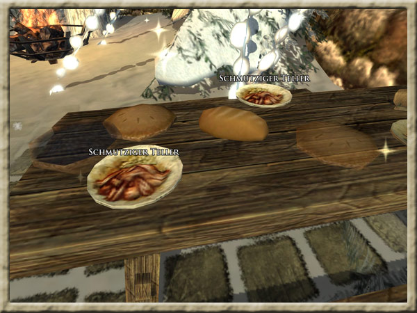 Müll befindet sich bei den Stationen des Wettessens in Winterheim und der Diener Basilius Windheim meint, Ihr solltet den Müll aufsammeln, Flecke wegwischen und dreckiges Geschirr von den Tischen des Wettessens abspülen. Hintergrund |