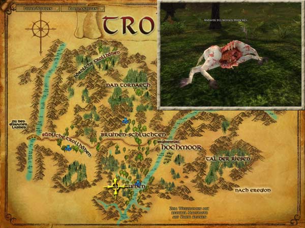 Tristan glaubt, der Kadaver muss irgendwo westlich von Echad Candelleth liegen, zwischen den Heimstätten der Gauradain und der Waldtrolle. Tristan hat Euch gebeten, nach dem Kadaver des weißen Hirschs zu suchen, den er durch die Trollhöhen verfolgt hatte, und dann mit dem Kadaver und den Pfeilen, die ihn zur Strecke brachten, nach Echad Candelleth zurückzukehren. Hintergrund Tristan hat Euch von dem weißen Hirsch erzählt, den er durch die Lande gejagt hat, und er glaubt, dass er ihn endlich erlegt hat, obwohl er den Kadaver nicht finden konnte. |