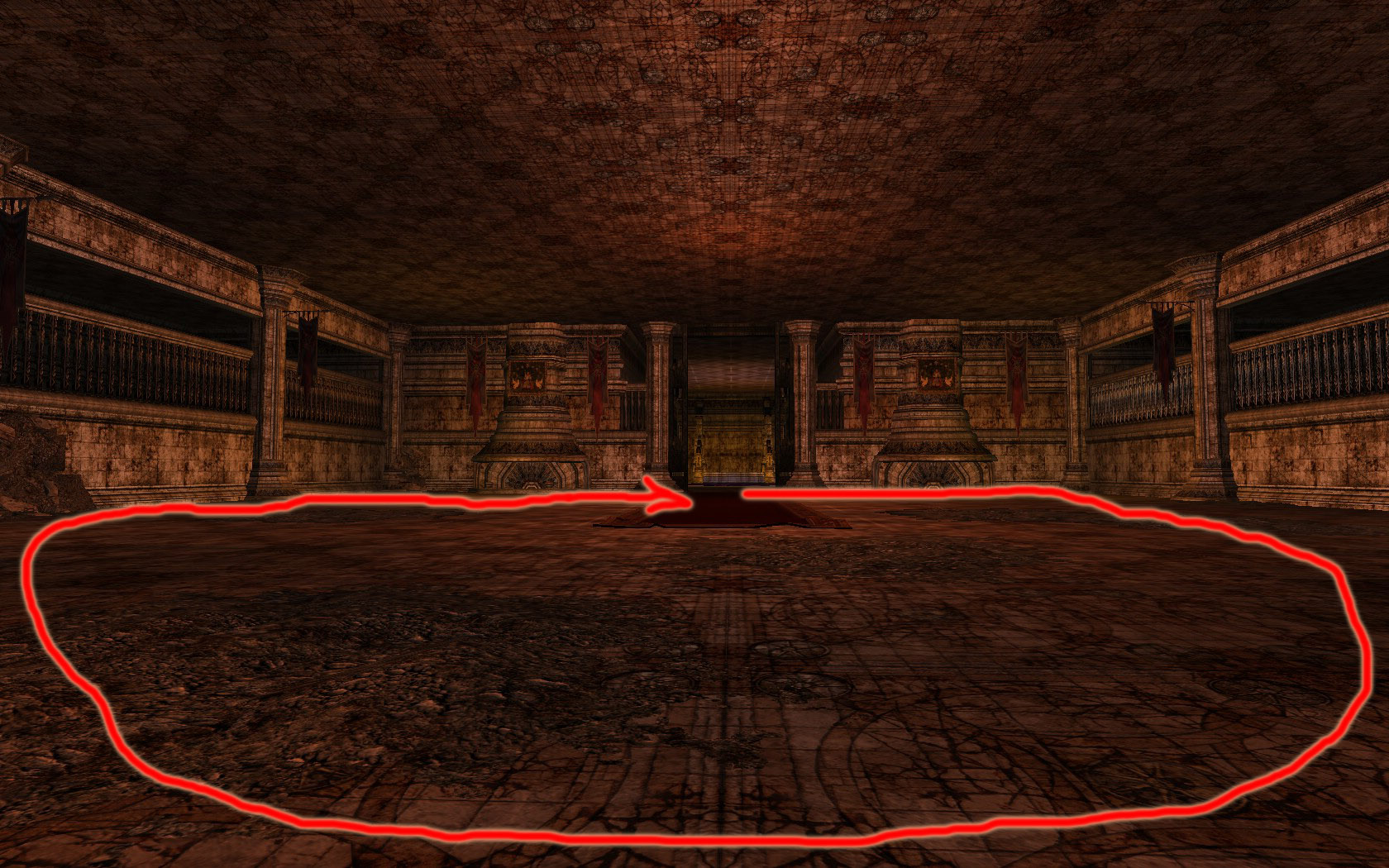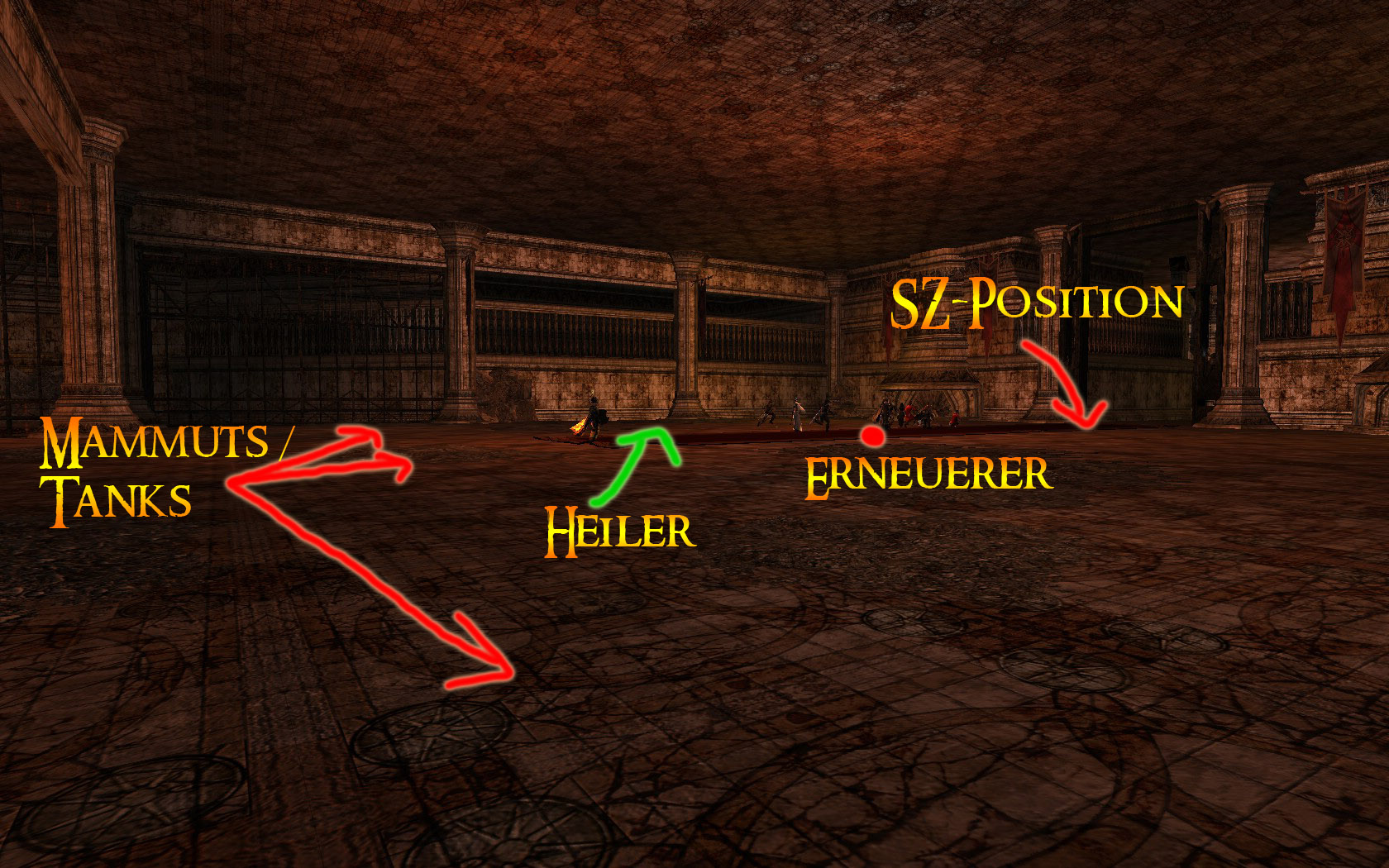 | Orientieren kann man sich hier sehr gut mit Hilfe des roten Teppichs. Die Mammuts haben, wenn sie an den Tanks stehen, nichts auf dem Teppich zu suchen. Die Gruppe läuft durch bis zum geschlossenen Tor, Heiler (+ Kundis) positionieren sich mittig im Raum, sodass sowohl die Tanks als auch die Gruppe am Tor erreicht werden können. |