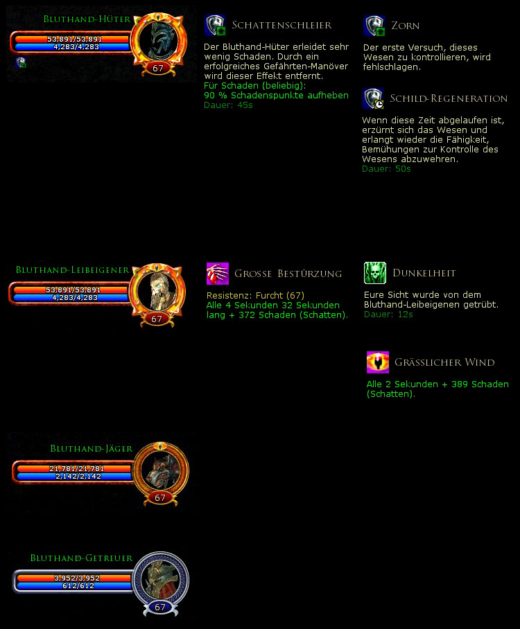 Die erste Addgruppe besteht aus jeweils 2 Adds aller Klassen. Die Warge und Getreuen sind dabei die eher harmlosen Adds. Wichtiger ist das Zusammenspiel aus den Hütern und ihren Leibeigenen. Die Hüter haben, wenn sie den Kampf beginnen, Aus der Beschreibung des Buffs geht hervor, dass man ihn durch ein erfolgreiches Manöver vorzeitig beenden kann. Die Geister sind die lästigsten Adds der ID. Sie können stunnen, begleitet von dem gezeigten Furchtdebuff. Befinden sich Gefährten im Furchtfeld, tickt der gezeigte Schaden (Grässlicher Wind). |
