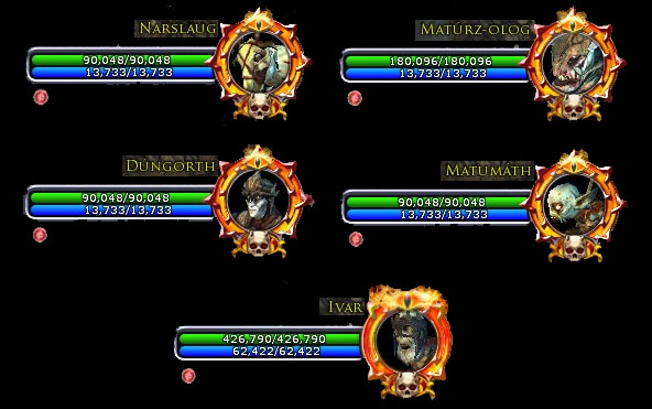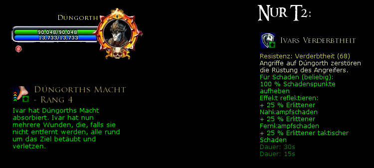 Auf T2 ist der Schaden, den der SZ von Waffenmeistern und Ivar erhält, um einiges größer als auf T1. Daher empfiehlt es sich, auf jeden Fall die Variante mit 2 Hauptleuten zu spielen, um den Schaden in der letzten Phase gegen Ivar abfedern zu können und die zusätzlichen Moralpunkte, die Ivar auf dieser Stufe besitzt, ebenfalls zu vernichten, bevor Ivar den Schlachtzug zerlegt. Für T2 gibt es eine empfohlene Variante, die vergleichsweise einfach zu spielen ist: Dúngorth, Narslaug, Matúrz-Olog |