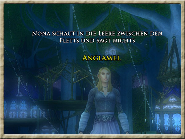 Nona befindet sich bei der Leiter, die von den Fletts, auf denen das Haus Celeborns steht, nach unten führt. Nona wartet darauf, dass Ihr ihr die Stadt Caras Galadhon zeigt. Hintergrund Nona hat sich von den Ereignissen in der Binsenlache erholt und ist nun daran interessiert, |