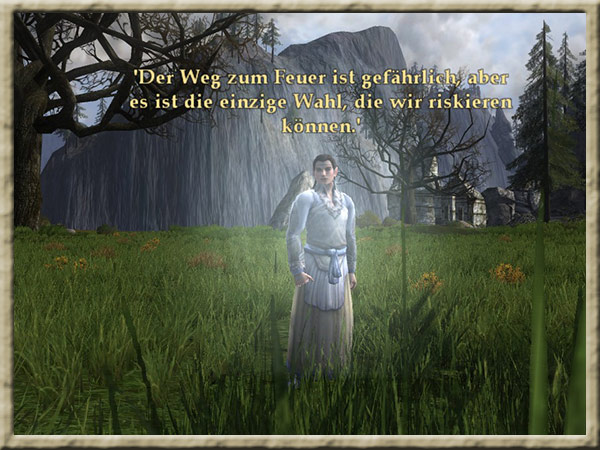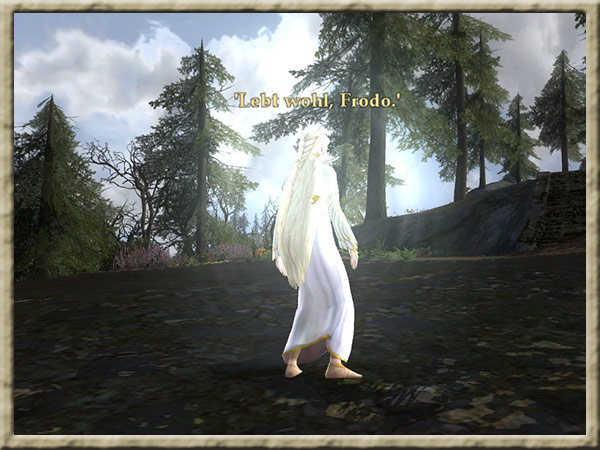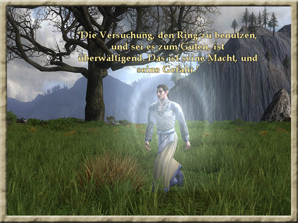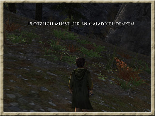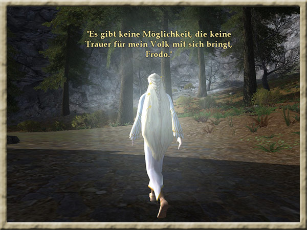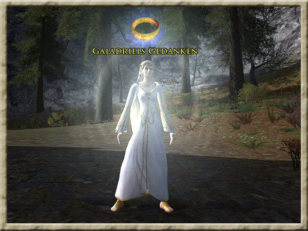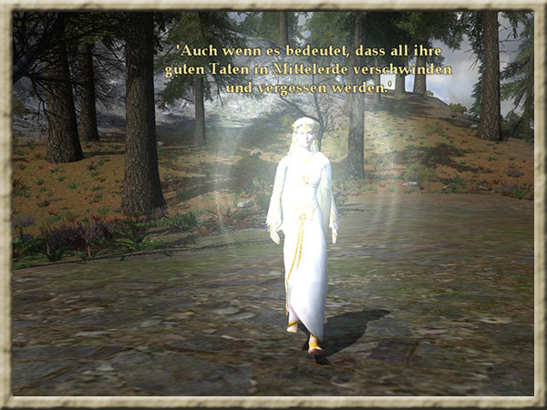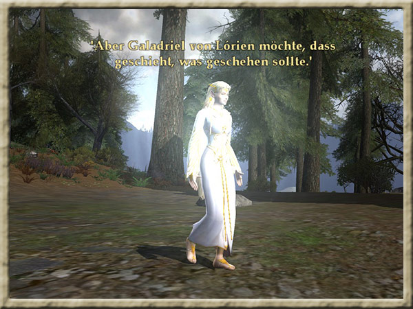 Galadriel befindet sich in ihrem Garten in Caras Galadhon. Ihr habt in ihren Spiegel geblickt und jetzt solltet ihr Galadriel berichten, was ihr gesehen habt. |