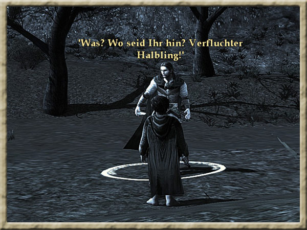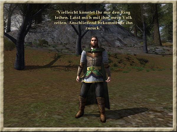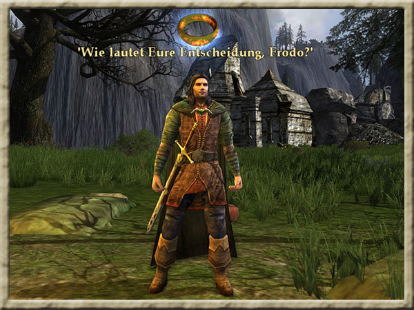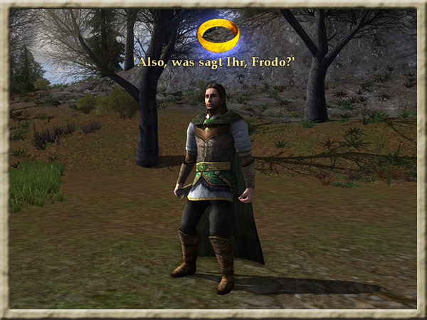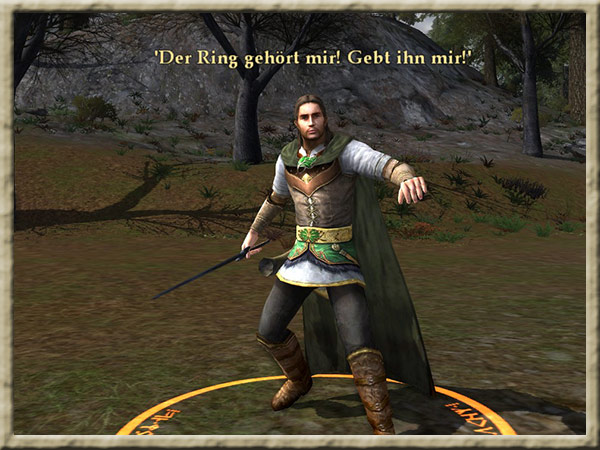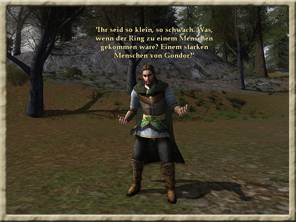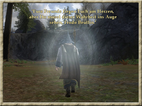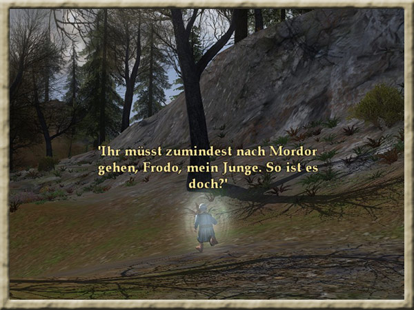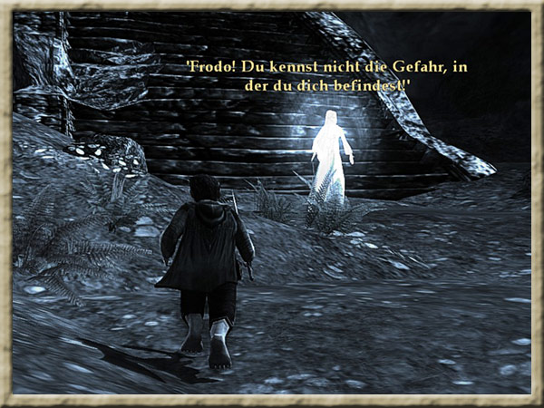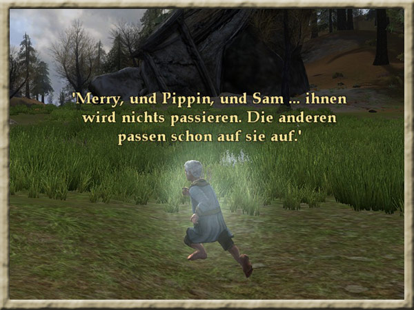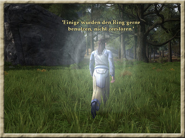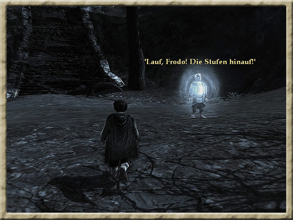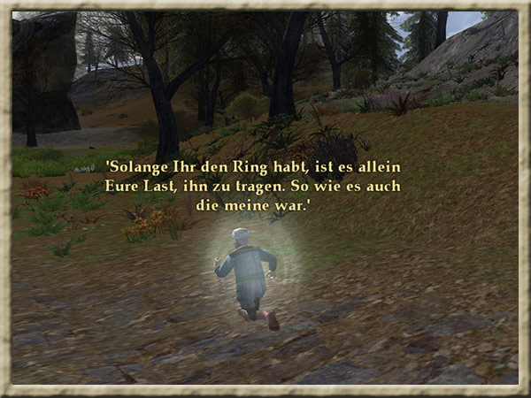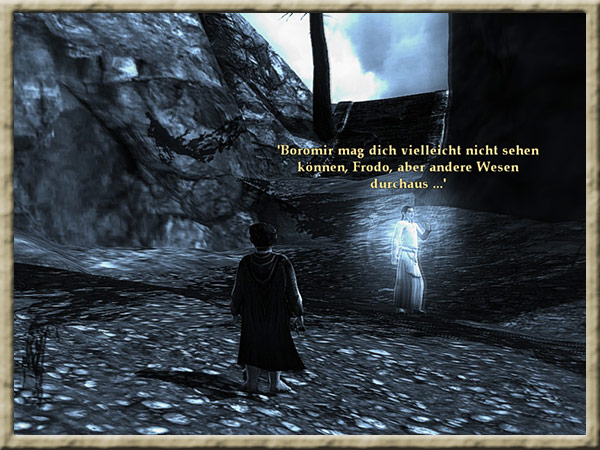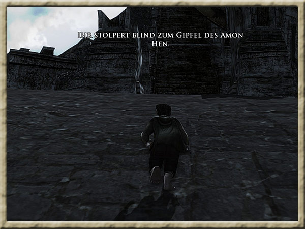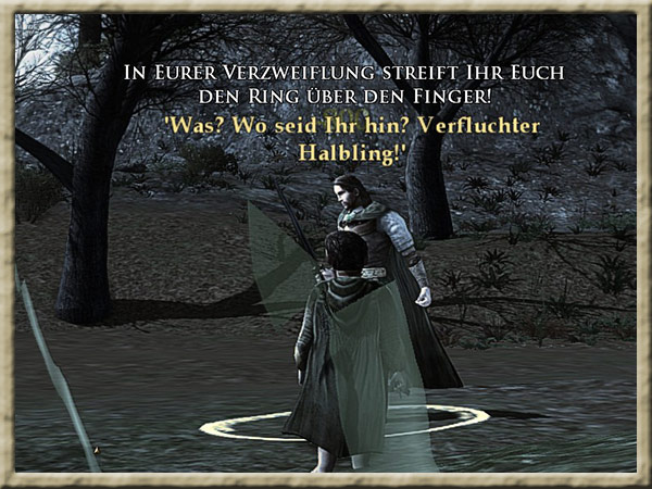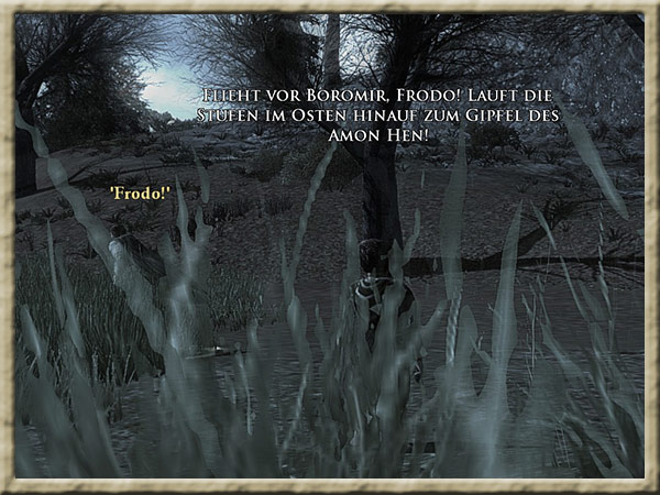 | Boromir ist dem Wahnsinn verfallen! Solange Ihr den Ring tragt, kann er Euch nicht finden und Euch nichts anhaben! Erklimmt den Gipfel des Amon Hen, um ihm zu entkommen. |