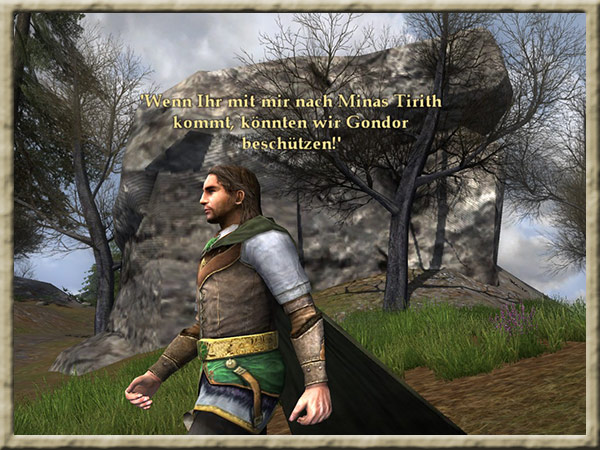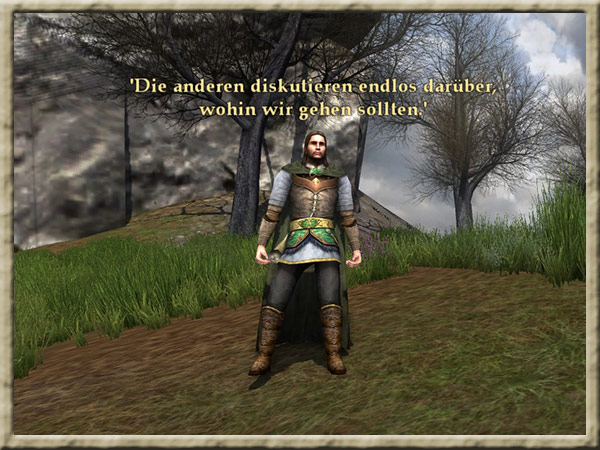 Aragorn und der Rest der Gefährten haben ihr Lager in Parth Galen in der Ostmauer aufgeschlagen. Es ist an der Zeit zu entscheiden, welche Gefährten Boromir nach Minas Tirith begleiten und welche, |