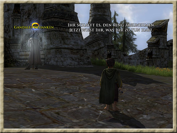 Ihr habt es geschafft, den Ring abzunehmen, und seid nur knapp dem Zorn Saurons entronnen. Gandalf kommt Euch abermals in den Sinn, und während Ihr zwischen den Ruinen auf der Spitze des Amon Hen steht, |