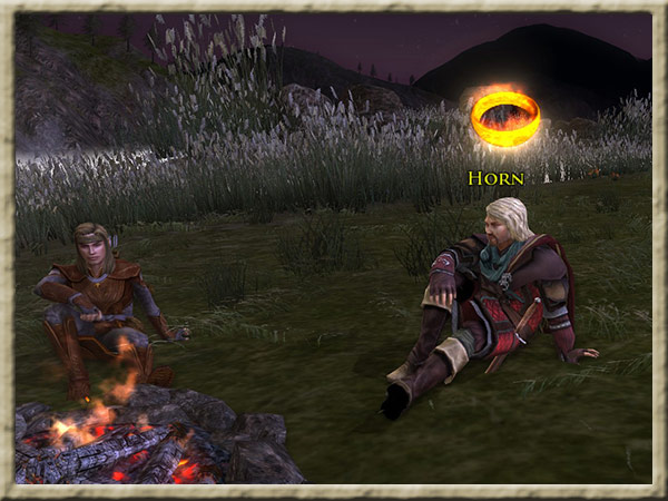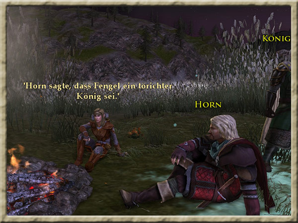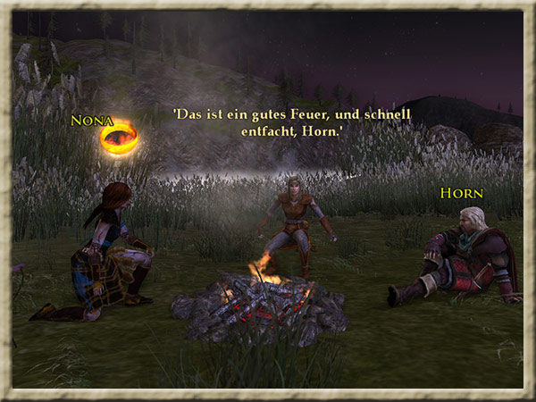 Horn und Nona sitzen einander am Lagerfeuer am Ufer des Anduin gegenüber. |