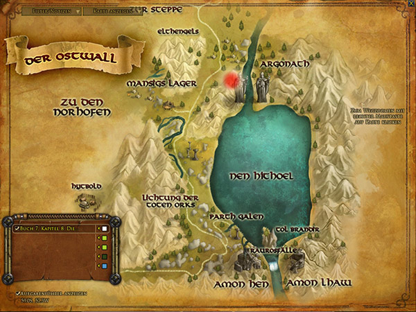 Horn hat Euch gebeten, mit Nona und Corudan zu sprechen, bevor Ihr mit dem Einsammeln der Äste fürs Lagerfeuer anfangt. Hintergrund Ihr seid am Ostwall angekommen, wo die Argonath auf beiden Seiten des Anduins in die |