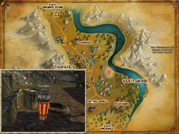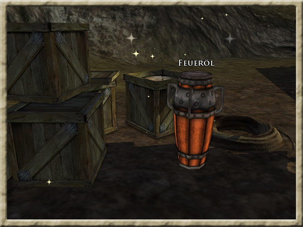 Feueröl-Fässer zum Anzünden von Pfeilen stehen im Ostling-Lager namens Olghakhósh. Ihr solltet Feueröl-Fässer in Olghakhósh zerstören. Hintergrund Ostlinge planen einen Feuerhagel auf Wachflut, indem sie die Spitzen ihrer Pfeile mit einer fauligen Flüssigkeit anzünden, |