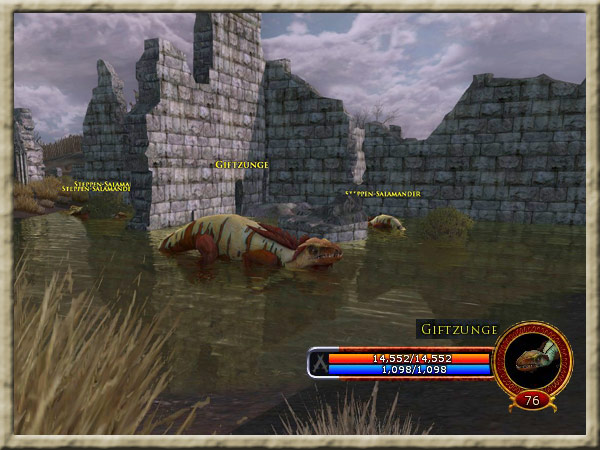 Ein grausamer alter Salamander namens Giftzunge hat schon viel zu lange diese Ruinen unsicher gemacht. Ihr solltet Giftzunge endlich den Garaus machen, denn dieses Biest wurde zu lange am Leben gelassen. Hintergrund Als Ihr die Höhle der Salamander in der nördlichen Steppe betretet, |