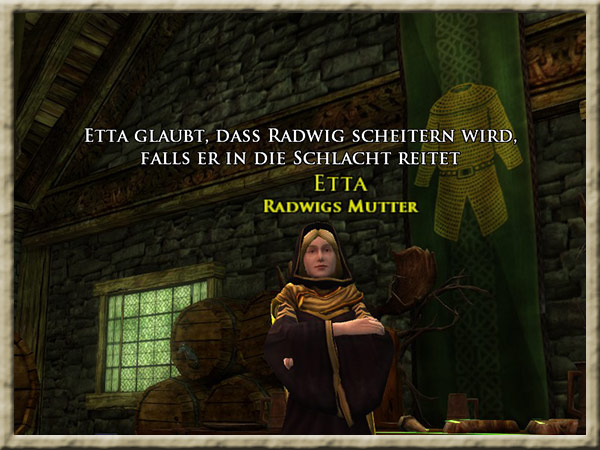 Etta befindet sich in der Methalle in Flutwend. Ihr solltet mit Etta sprechen und ihre Meinung anhören. Hintergrund Than Radwig von Flutwend und seine Mutter Etta sind sich über das beste Vorgehen gegen die Feinde um ihre Stadt herum uneinig. |
