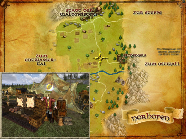 | Sprecht mit dem Hauptmann der Kaufmannswache beim Außenposten des Händlers |