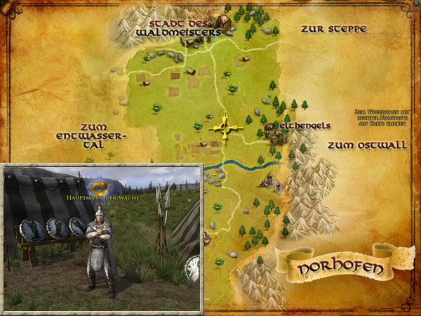 Der Wachhauptmann bei den Händlern befindet sich im Außenposten der Händler, westlich von Elthengels. Der Wachhauptmann hat eine Belohnung für jenen versprochen, der eine Kampfgruppe in den Norhofen besiegen kann. |