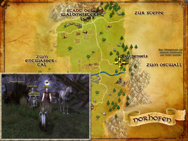 Runald und seine Familie befinden sich mit ihrem Wagen am südlichen Eingang von Elthengels. Jetzt wo all die Vorbereitungen getroffen und alle Gefallen abgeschlossen sind, solltet Ihr ein letztes Mal mit Runald sprechen, |