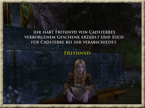 Frithynd befindet sich draußen am Brunnen von Elthengels, außerhalb der Taverne, und denkt nach. Cadsterre hat Euch beten, dass Ihr Euch für ihn bei Frithynd verabschiedet, da sie sich nicht dazu bringen kann, es selbst zu tun. |