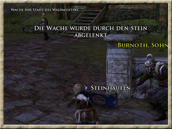 Burnoth lagert außerhalb der Methalle der Stadt des Waldmeisters. Ihr solltet mit Burnoth sprechen, sobald Ihr bereit seid, ihm zu helfen. Hintergrund Burnoth ist durch die ungewöhnlich fröhliche Haltung von Greve Athelward und |