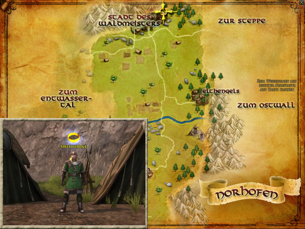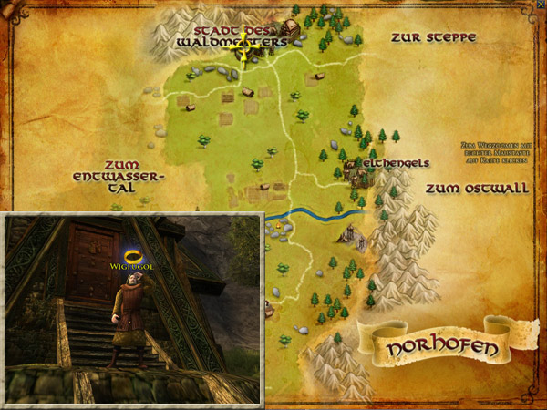 Walnoth befindet sich nahe dem Brunnen in der Mitte der Stadt des Waldmeisters. Walnoth wartet auf die Ergebnisse Eurer Verhöre. |