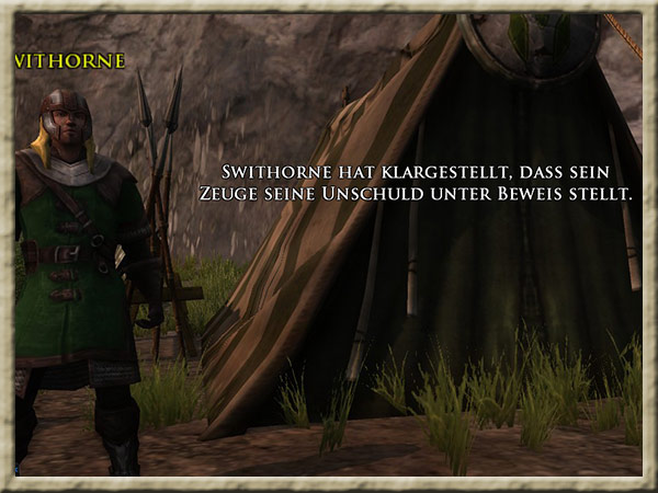 All die Verdächtigen befinden sich in der Stadt des Waldmeisters: Swithorne ist bei den Zelten der Rohirrim an der Methalle, Walnoth möchte, dass Ihr die Leute verhört, die seiner Ansicht nach die Hauptverdächtigen für die begangenen Verbrechen darstellen. Hintergrund Walnoth glaubt, dass er die Liste der Verdächtigen, auf drei Personen beschränkt hat. Den Soldaten Swithorne, |