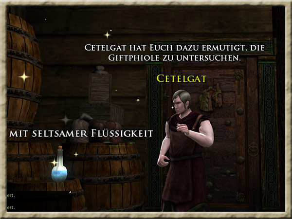 Cetelgat arbeitet in der Küche von Greve Athelward, westlich der Methalle der Stadt des Waldmeisters. Walnoth hat Euch gebeten, mit Cetelgat, dem Koch des Greven, über die Phiole zu sprechen, die in der Küche gefunden wurde. Hintergrund Walnoth wurde dazu aufgefordert, eine Untersuchung bezüglich der Giftphiole, die in Athelwards Küche versteckt war, |